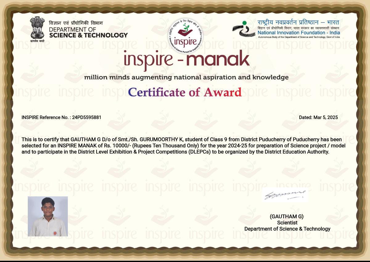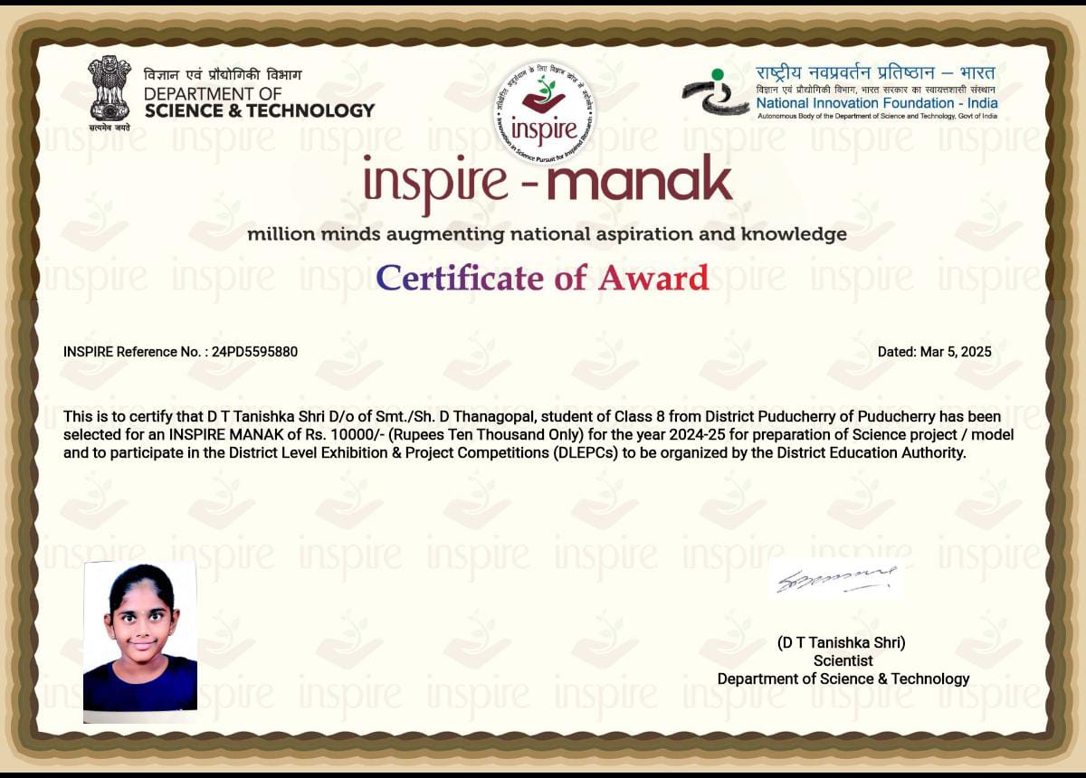 D. T. Tanishka Shri from Grade VIII and G. Gautham from Grade IX got selected in Inspire Award 2024 - 25 and they won Rs.10,000 cash award too. They also got selected to participate in District level Science Project. Wow.. what a proud moment to share with everyone. .... Congratulations Dear children......!!!!